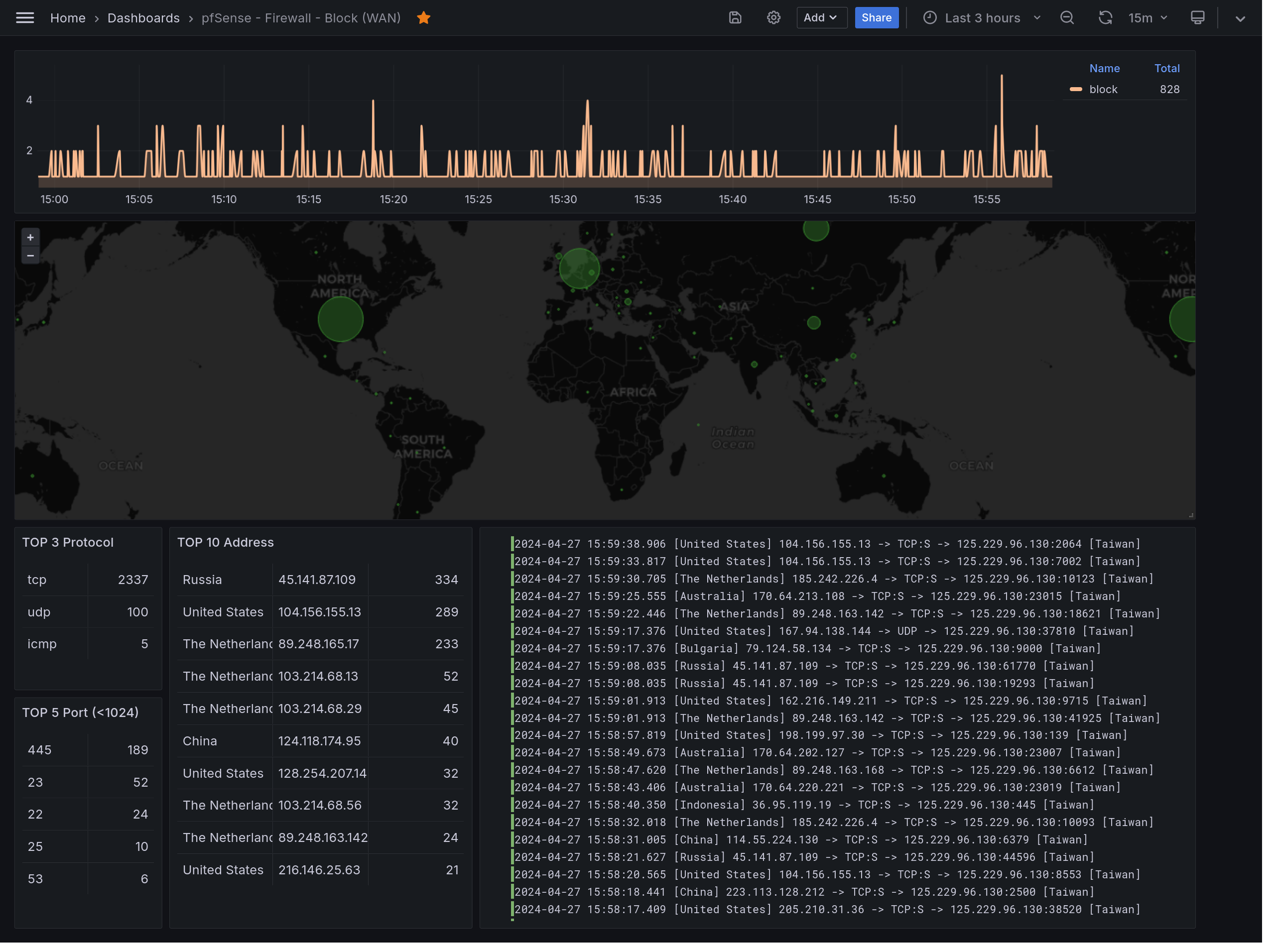 Once logs have been written into Loki with proper labels. We can easily create a dashboard in Grafana with Loki datasource. Here is an example dashboard of pfSense filterlog in this case. As usual, try download and import into your own Grafana server.